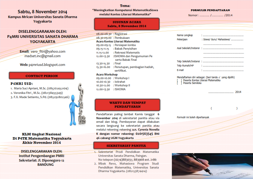 KLM (Kontes Literasi Matematika) dan Workshop akan dilaksanakan pada hari Sabtu, 8 November 2014 di Kampus Mrican Universitas Sanata Dharma Yogyakarta.